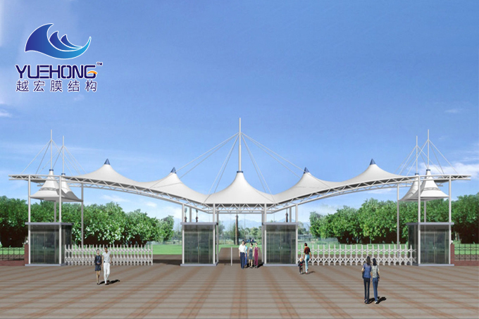 廣州膜結構廠家門口廊道設施服務范圍:學校門口、工廠門口、公司門口、各種建筑樓門口等等。已成為人們視覺最先接觸的部分,還應具有了很強的標識性。并且能體現出建筑入口的個性以及屬是屋頂經常采用的形式。