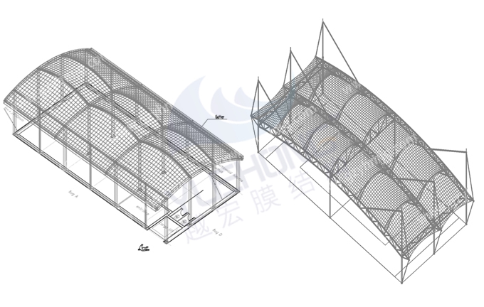 越宏膜結構廠家的游泳池膜結構遮陽棚是由鋼結構和膜材組成,分別有張拉式膜結構、索膜結構、骨架式膜結構、空間結構式等供選擇,根據不同場景進行設計出個性化膜結構。