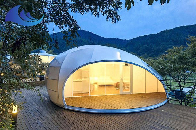 帳篷酒店采用高強度中空鋁合金結構或者是鋼結構,表面具備有防腐處理,優選膜結構頂棚,安全耐用,防水、阻燃、防紫外線。