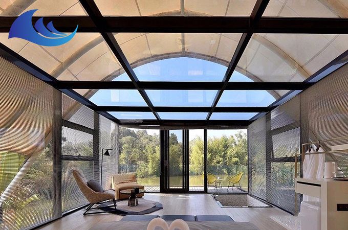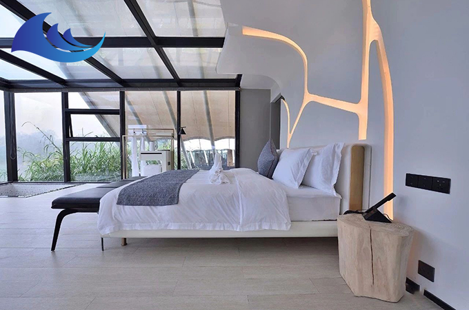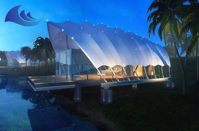 帳篷酒店采用高強度中空鋁合金結構或者是鋼結構,表面具備有防腐處理,優選膜結構頂棚,安全耐用,防水、阻燃、防紫外線。